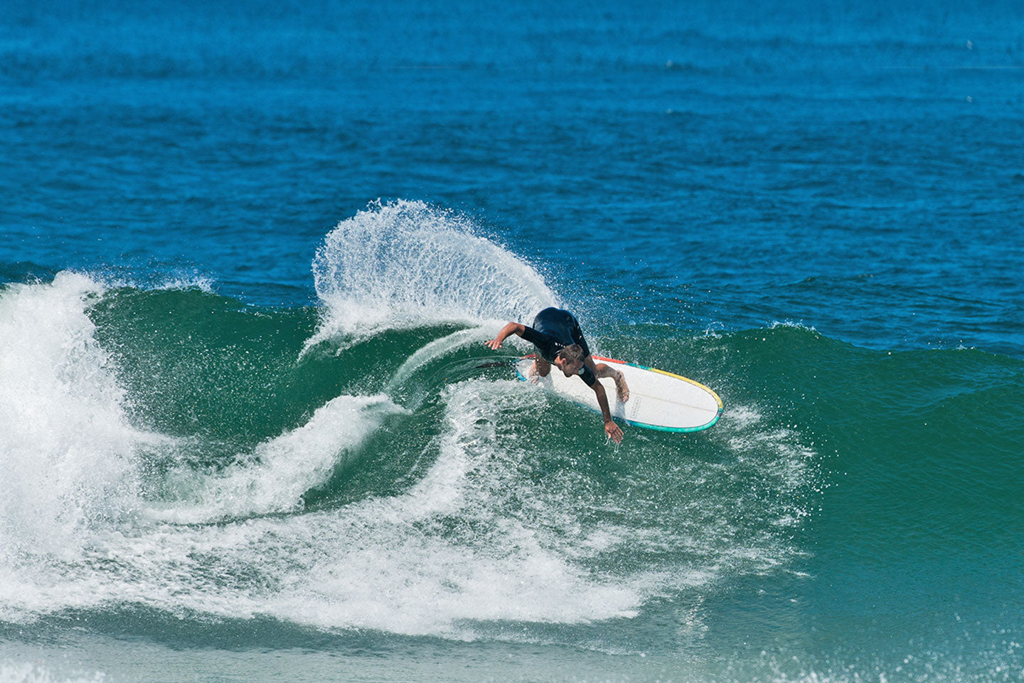 Not too big, not too small; mid length surfboards are great for those surfers wanting to catch waves easily while still retaining a certain degree of maneuverability. The features of a mid length surfboard include the full nose, low-to-moderate rocker, boxy rails and mid-to-high volume. Often referred to as a “mini-mal”, and popular for being very stable, mid length surfboards are typically 7 – 8 feet in length and really shine in small to medium size surf.
